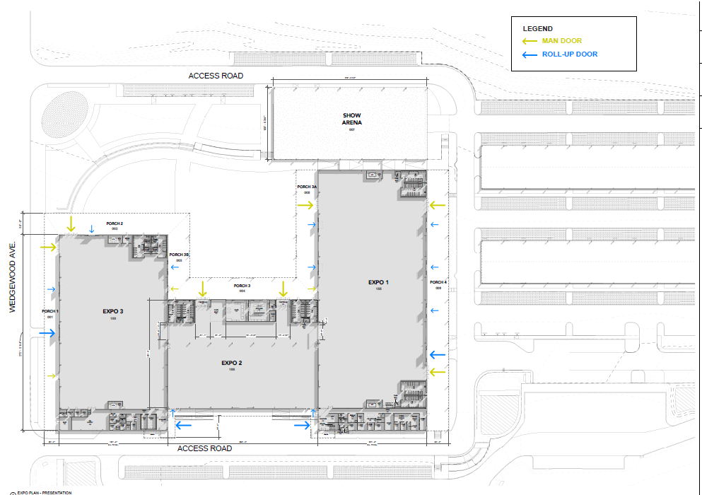 Expo 3 is 41,359 gross square feet and houses event office spaces, storage and office space for food service management, and maintenance storage. Expo 3 has one restroom block with showers, one unisex/family restroom, and access to the restroom block in Expo 2 through a separate hallway.